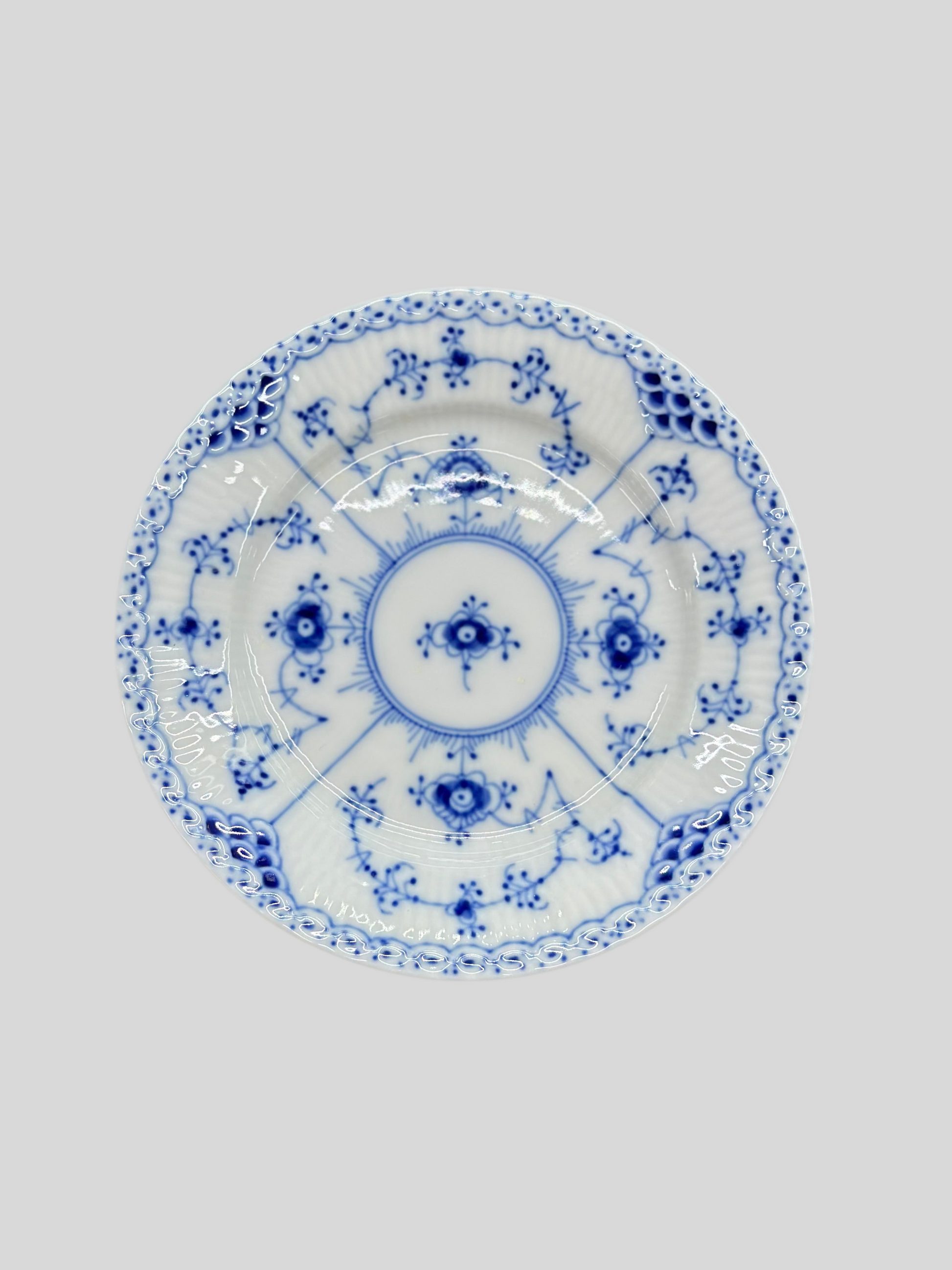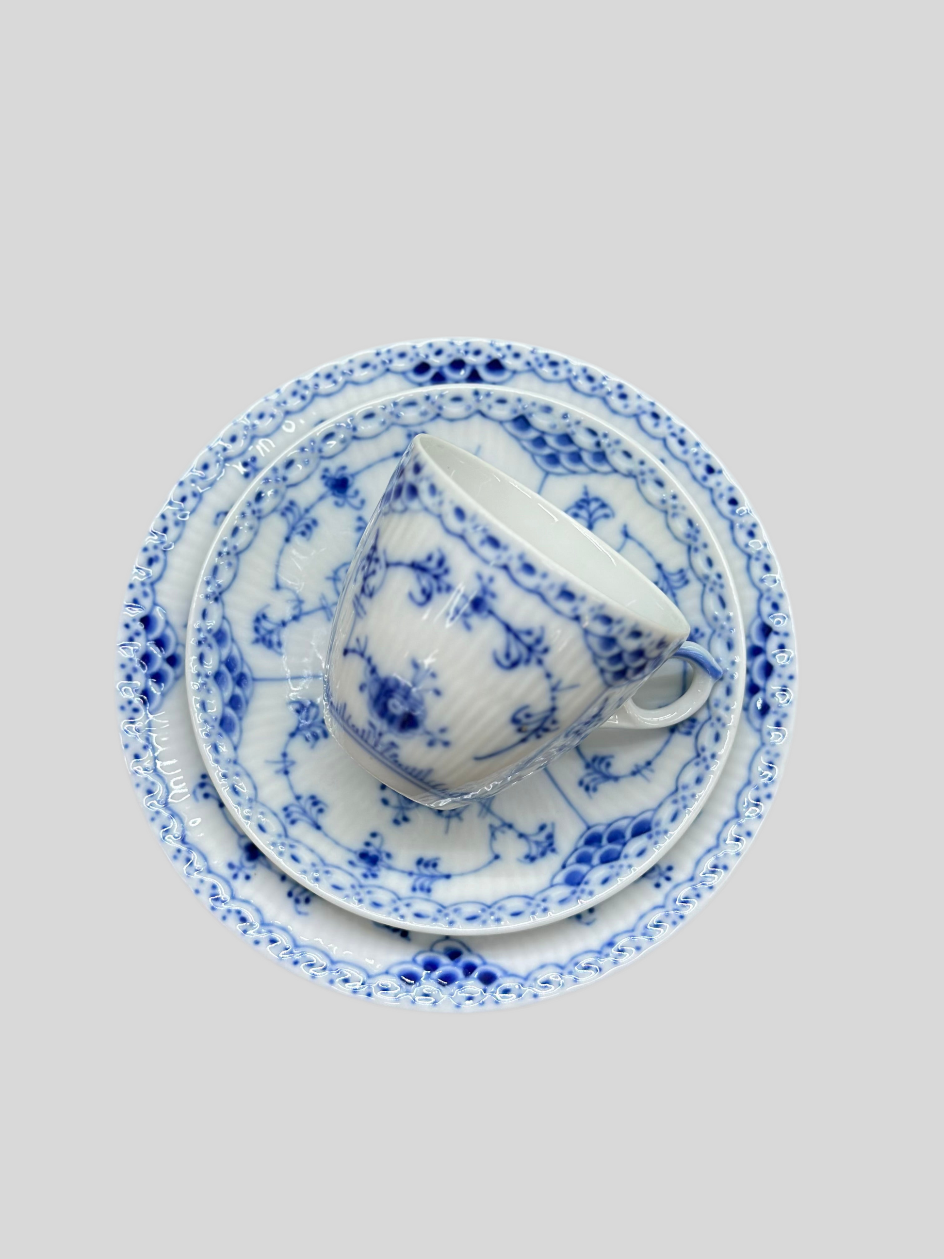 Royal Copenhagen Blue Fluted Half Lace Trio Set - Cup & Saucer (#719) and Cake Plate (#575)